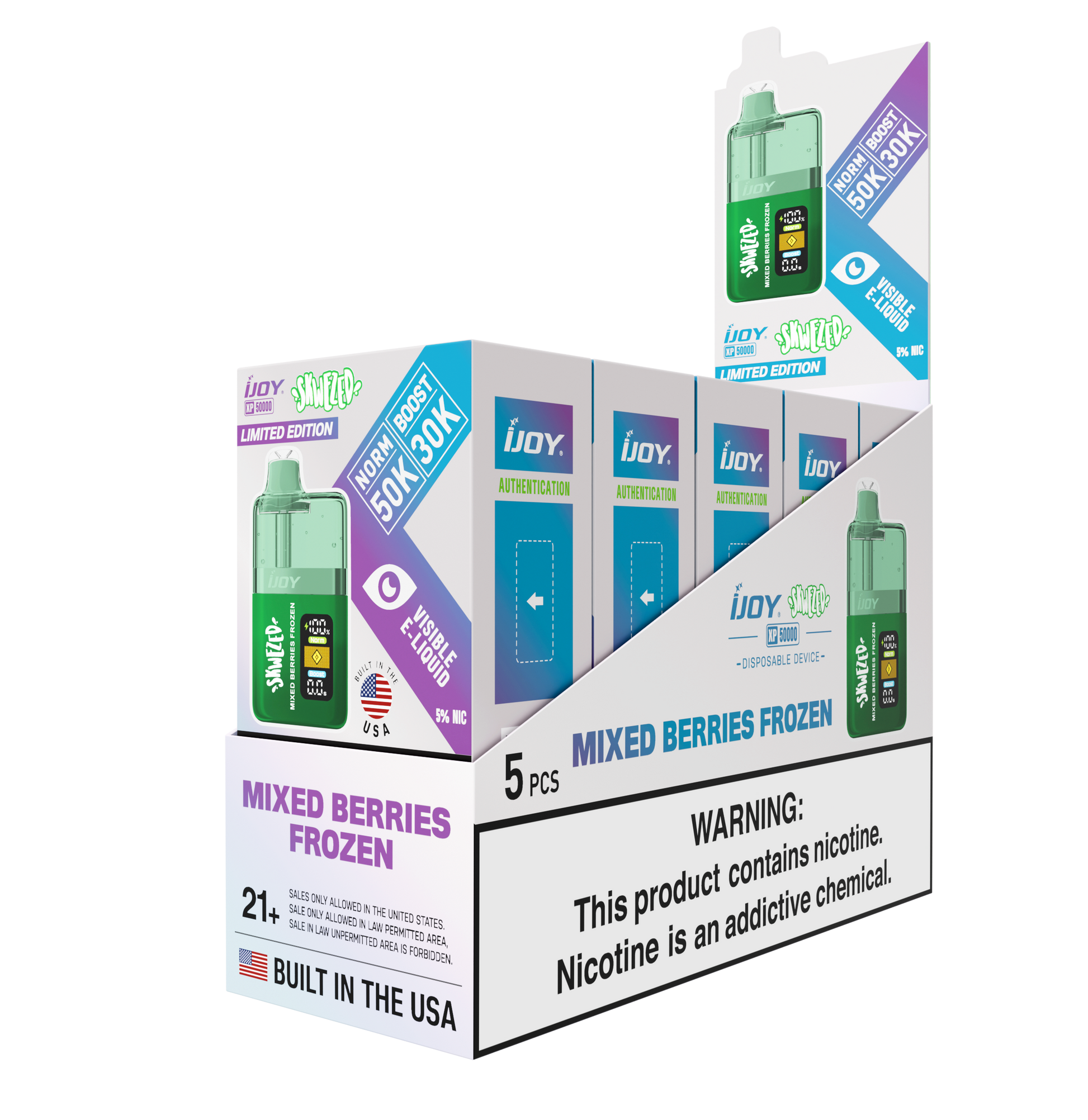 The Skwezed x iJoy Disposable blends power, flavor, and control, all-in-one. Filled with our freshly Skwezed Mixed Berries Frozen e-liquid, strawberry, blueberry, and blackberry flavor notes come together in an icy, cool flavor mix. Berry in the front, berry in the back, and all around chill with the addition of smooth menthol.